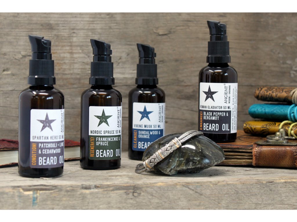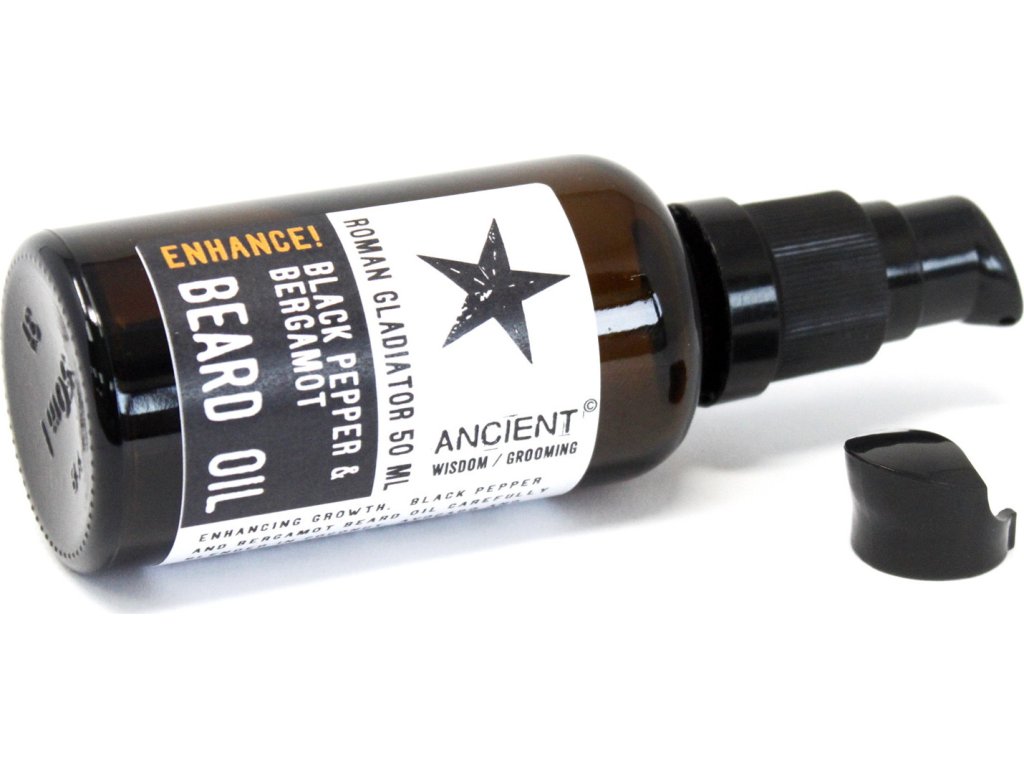 50ml Olej na Bradu - Rímsky Gladiátor - Dajte si pauzu od ovocia a kvetín a vyskúšajte túto čistý, ale zároveň exotický olej na fúzy s vôňou čierneho korenia a bergamotu, jemne zmiešaného s marhuľovým a arganovým olejom a vitamínom E na každodenné použitie.